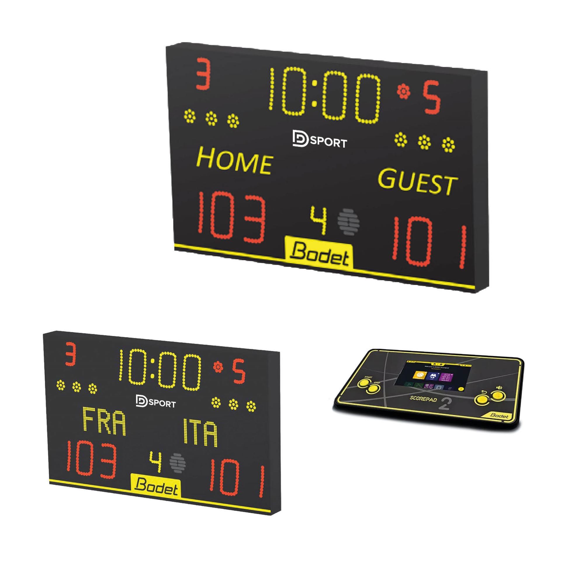 De 8015 van Bodet is een modern en compact elektronisch scorebord, ideaal voor indoor sporten zoals basketbal, volleybal, handbal en futsal. Dankzij de heldere LED-display en intuïtieve bediening biedt het een uitstekende oplossing voor sporthallen en gymzalen.
