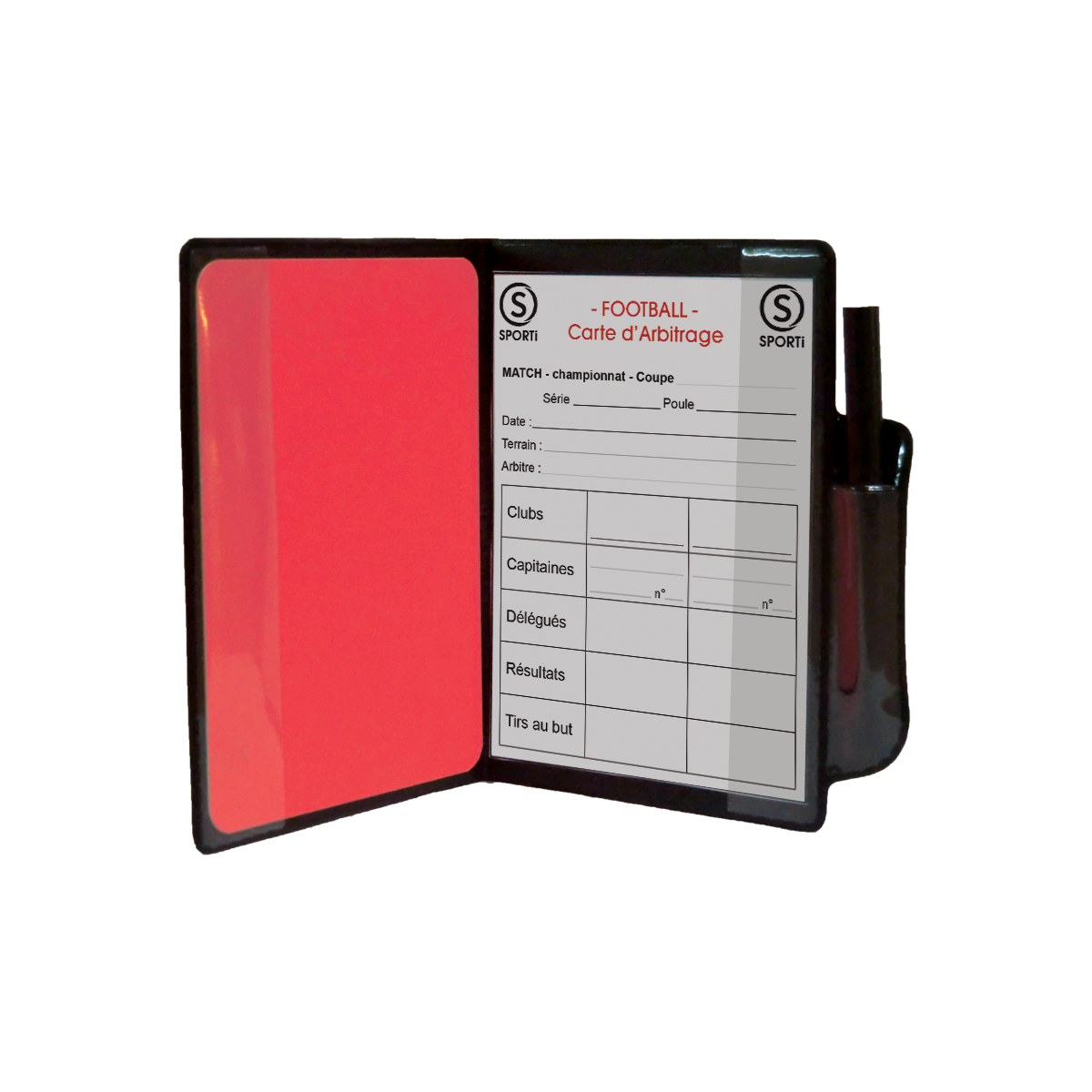 Deze standaard set bevat 3 kartonnen kaarten (1 rode, 1 gele en 1 witte), een boekje met 15 scheidsrechters formulieren en een potlood.